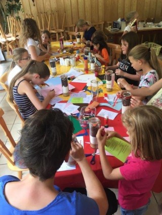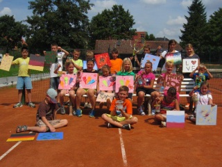 Leuchtende Farben und pfiffige Ideen – entdeckt den Picasso in euch! Bildunterschrift: Kräftige Farben und strahlende Gesichter – die Kinder hatten viel Spaß beim Malen im Tennisheim. Für das geplante Tennisspielen war es leider zu heiß. Viele kreative Ideen entwickelten die Kinder beim Sommerferienprogramm der Tennisabteilung zu Beginn der Ferien. Mit sehr viel Geduld kreierten sie mit verschiedenen Materialien wie Glitzerpulver, Muscheln und Mosaiksteine ihr ganz persönliches Bild auf Holzplatten. Stolz konnten die Kinder diese Kunstwerke mit nach Hause nehmen, wo sie sicher einen geeigneten Platz dafür finden werden. Ganz herzlichen Dank an die Fa. Polzer, Jagsthausen, die uns die Holzplatten zur Verfügung stellten. Auch Danke an die fleißigen Helferinnen Larissa Erhard, Jessica Fritscher und Vanessa Windmüller an diesem Vormittag.
